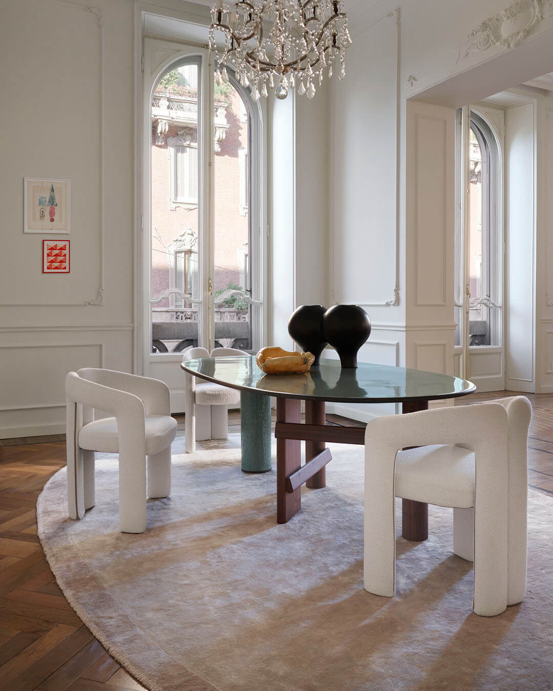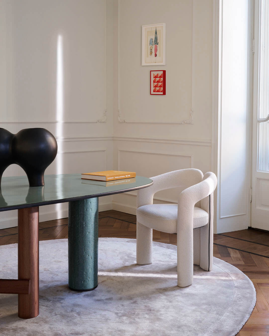 Dudet, zaprojektowany jako dopełnienie stołu Sengu, przywołuje ducha lat 70. poprzez swój miękki, przytulny wygląd i rzeźbiarską formę. Składa się z trzech wyrazistych elementów: obszernej poduszki siedziska oraz dwóch giętych tub, które w jednej płynnej formie łączą nogi, podłokietniki i oparcie. Ta "mała architektura" jest nie tylko estetyczna, ale również odpowiedzialna środowiskowo – fotel zaprojektowano z myślą o łatwym demontażu, co pozwala oddzielić stalowy stelaż od pianki poliuretanowej. Dzięki temu możliwy jest recykling wartościowych materiałów, takich jak stal, co czyni Dudet przykładem zrównoważonego designu o ponadczasowej formie.