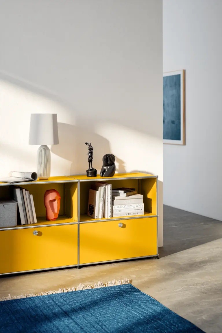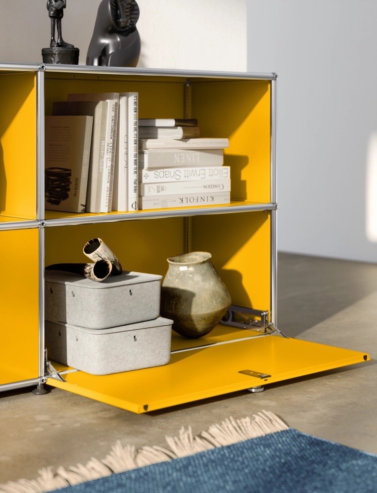 Mebel oparty jest na charakterystycznej, chromowanej konstrukcji stalowej z kulistymi łączeniami oraz lakierowanych panelach metalowych, które nadają mu ponadczasowy, nowoczesny wygląd. Dwa uchylne fronty pozwalają dyskretnie ukryć zawartość, natomiast otwarte wnęki idealnie sprawdzą się na książki, sprzęt RTV lub dekoracje. Modułowa budowa umożliwia zmianę konfiguracji oraz dostosowanie wymiarów do indywidualnych potrzeb. Wnętrze zamkniętych modułów można wyposażyć w dodatkowe półki lub szuflady, a także dodać przelotkę na kable lub wysuwaną półkę pod gramofon. To uniwersalne i funkcjonalne rozwiązanie do salonu, gabinetu lub przestrzeni komercyjnej.