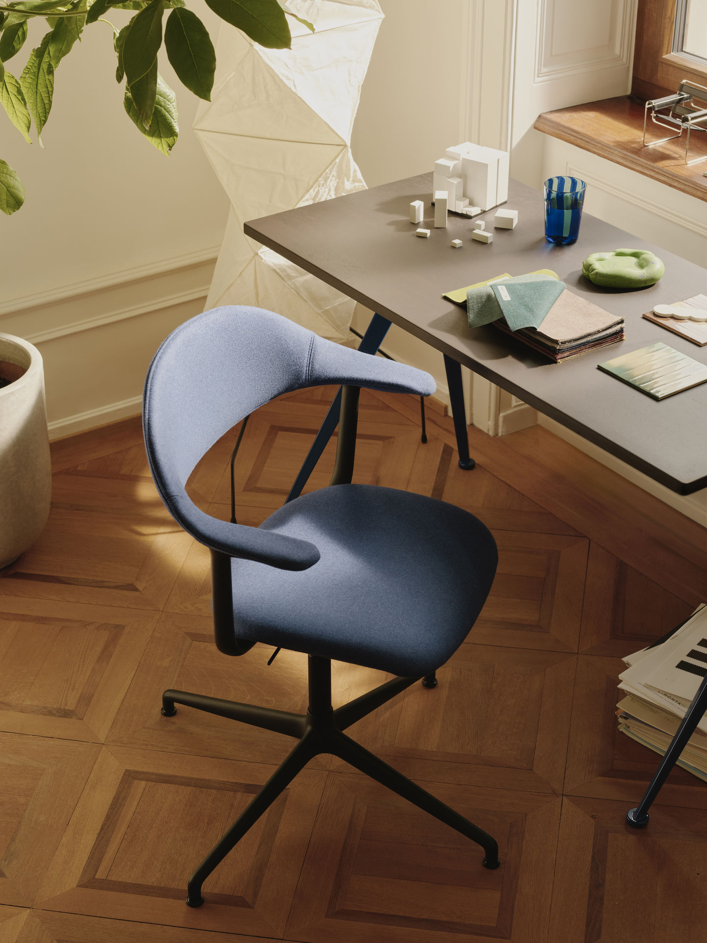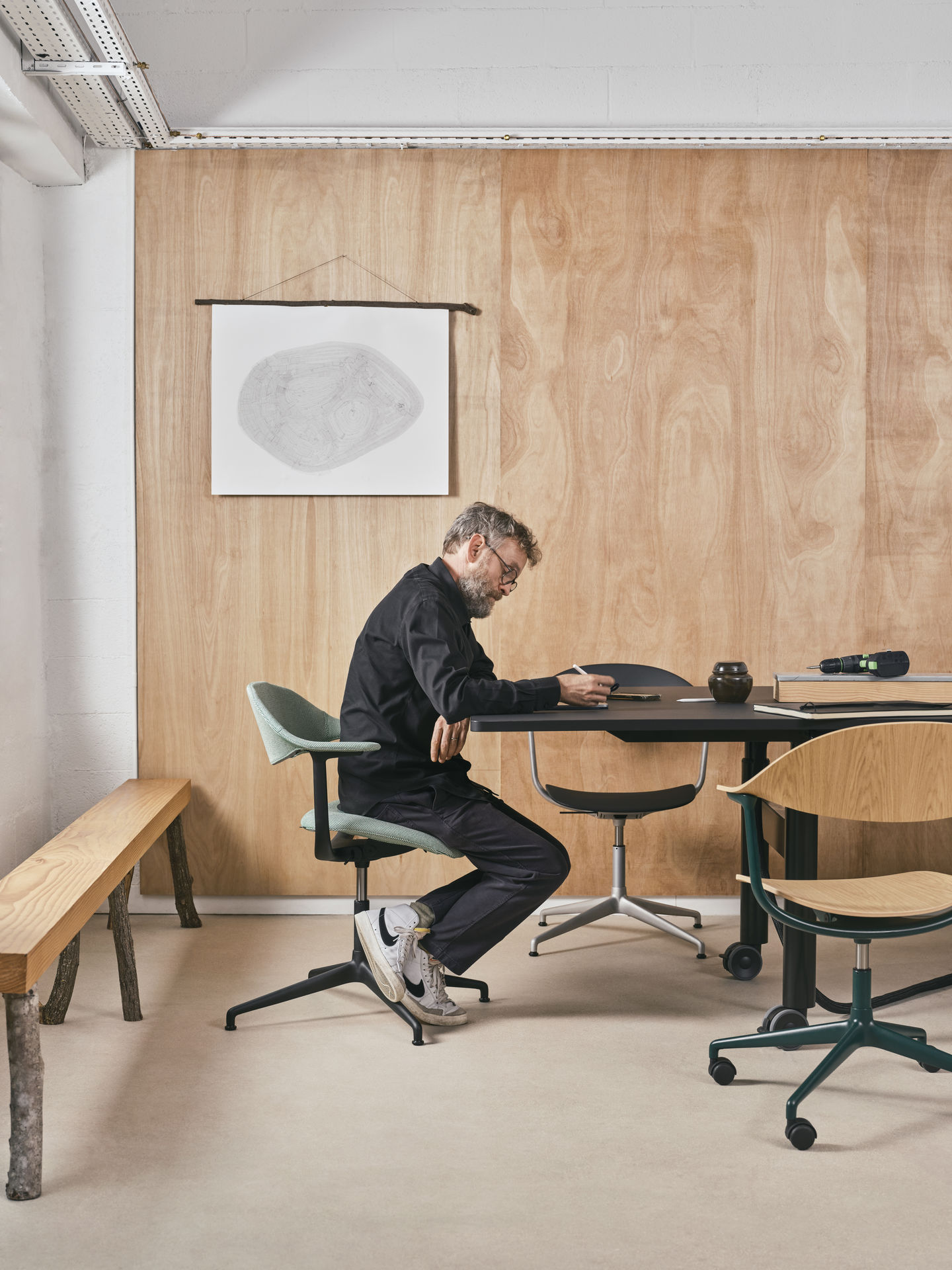 Uniwersalne krzesło Mynt Erwana Bouroulleca łączy domową estetykę z dynamicznym doświadczeniem siedzenia, dzięki opatentowanemu mechanizmowi reagującemu na ciężar ciała, który niezależnie reguluje ruch siedziska i oparcia. Automatyczne dostosowanie oporu i dyskretny design sprawiają, że Mynt to wszechstronny mebel idealny do biura, przestrzeni wspólnych, a także domowych stołów.