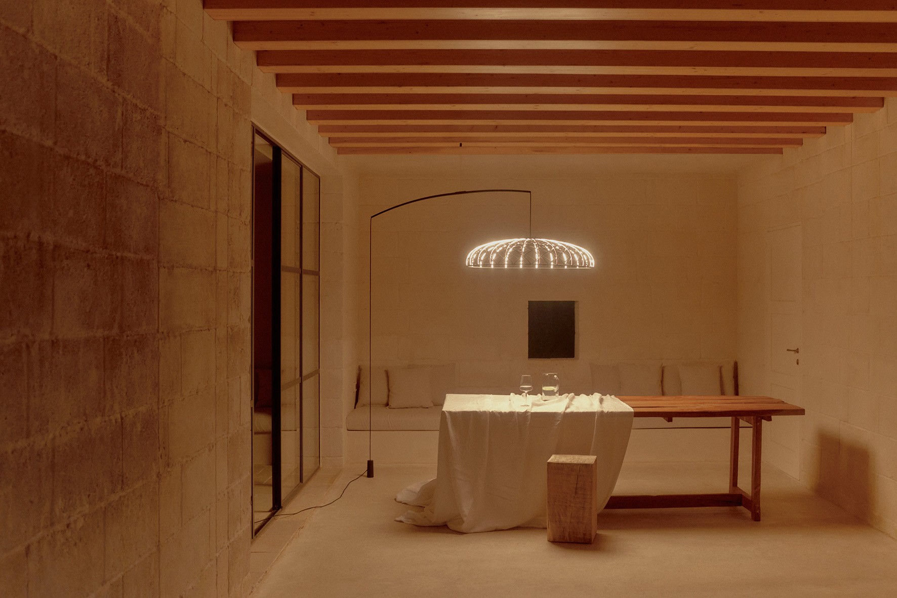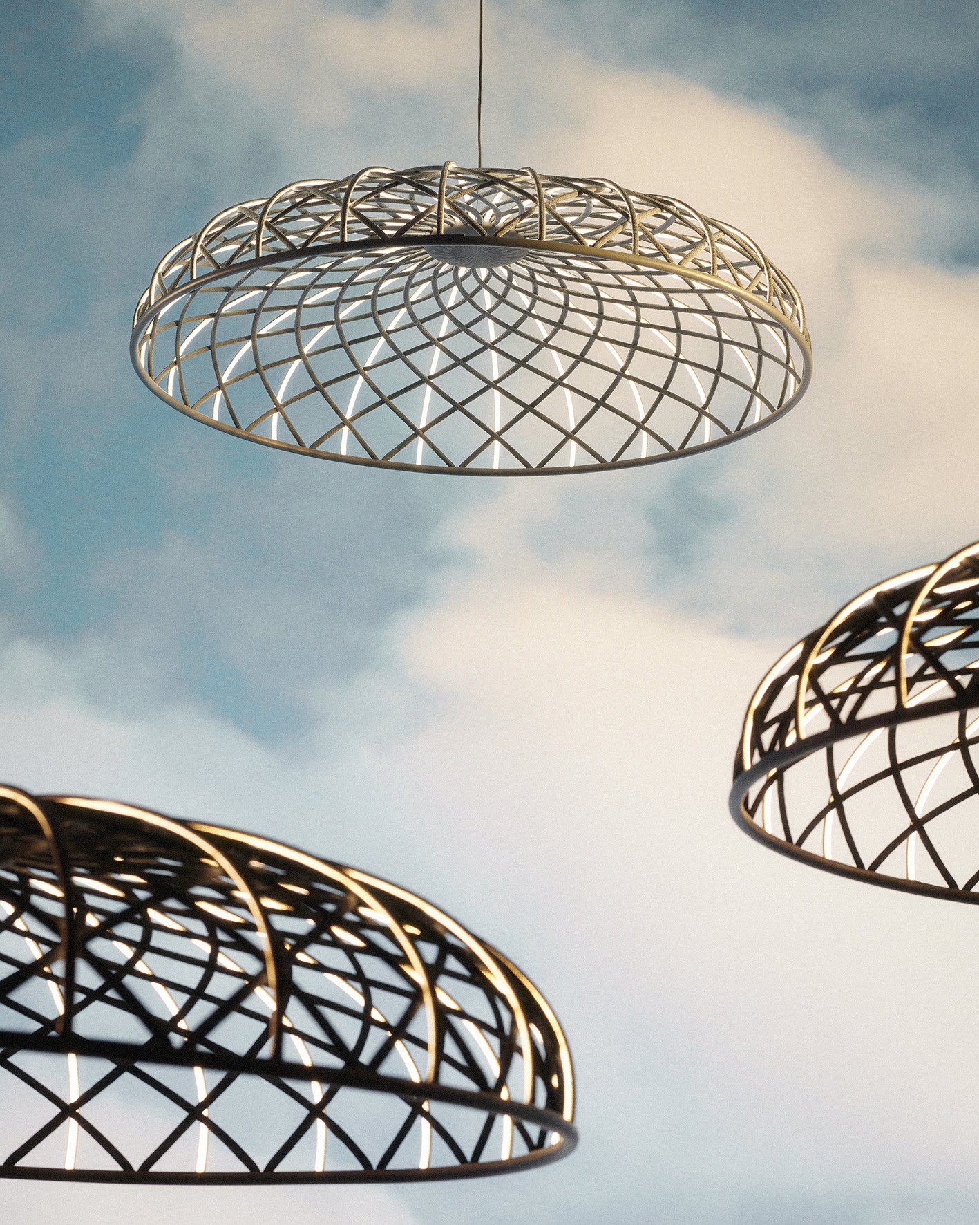 Skynest Motion to nowoczesna lampa wisząca, która redefiniuje pojęcie oświetlenia dekoracyjnego. Jej charakterystyczna kopuła zbudowana jest z sieci przeplatających się elementów – części świetlnych i ciemnych – tworzących wyjątkowy, półprzezroczysty wzór. Każdy świecący segment zasilany jest osobno przez mikrozłącza, a specjalna, dwukolorowa siatka z recyklingowanego poliestru zapewnia optymalne rozproszenie światła, dzięki białemu wnętrzu skierowanemu ku środkowi kopuły. W górnej części lampy znajduje się wbudowany system wyważania, który automatycznie reguluje pozycję klosza, gwarantując jego stabilność. Dodatkowym atutem jest specjalny element podłogowy, który umożliwia łatwą regulację wysokości i pozycji oprawy, zapewniając użytkownikowi pełną kontrolę nad aranżacją oświetlenia w przestrzeni. Lampa dostępna jest w czterech wykończeniach kolorystycznych: Blue Tourmaline, Almond, Anthracite oraz Brick Red. Plastikowa struktura nośna pomalowana jest w identycznym odcieniu co tkanina, a wbudowana elektronika oraz ściemniacz LED czynią z niej rozwiązanie nie tylko estetyczne, ale i funkcjonalne.