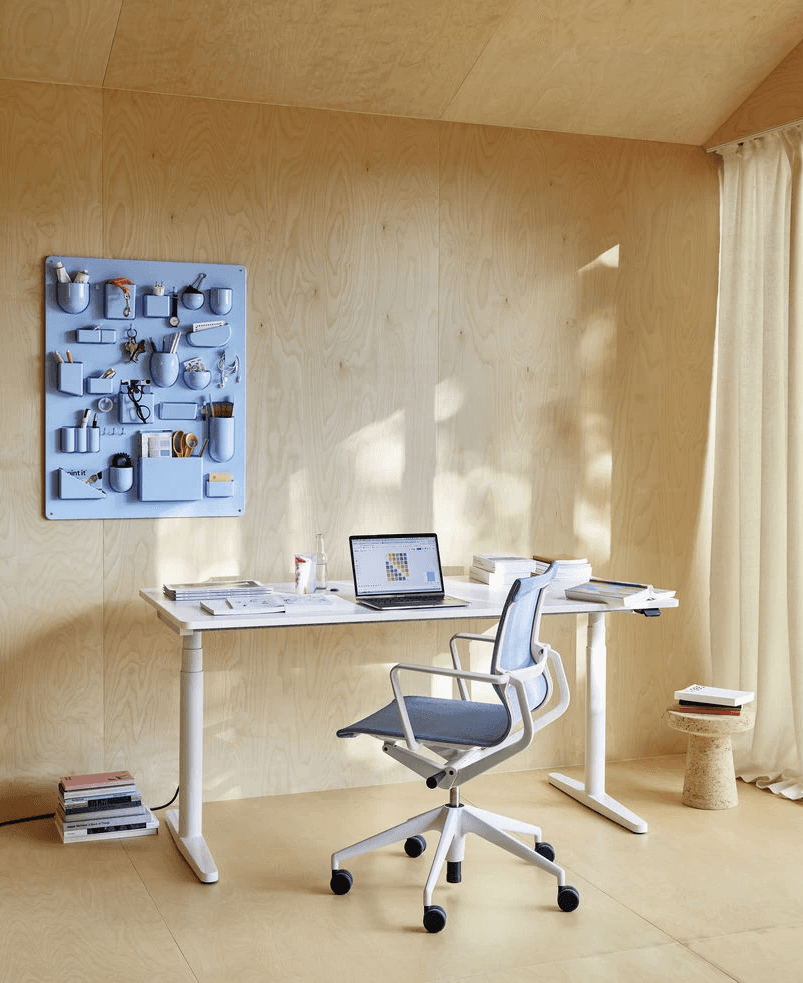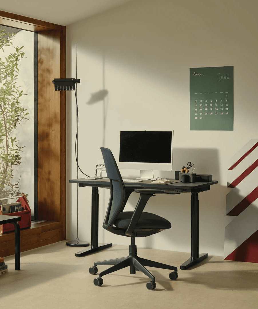 Nawet w domowym biurze warto zmieniać pozycję pracy – na przemian siedząc i stojąc przy komputerze. Biurko Tyde 2 Home Desk, wyposażone w elektryczną regulację wysokości, umożliwia wygodną i zdrową pracę w obu pozycjach. Dzięki starannie zaprojektowanej formie i zastosowaniu przyjaznych materiałów, biurko harmonijnie wpisuje się w różnorodne aranżacje wnętrz. Jego techniczne elementy są dyskretnie ukryte, co nadaje mu swobodny, domowy charakter. Tyde 2 dostępne jest w dwóch wariantach: owalnym (beczułkowatym) oraz prostokątnym.