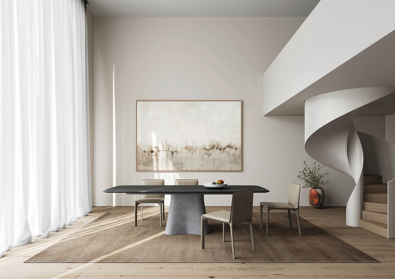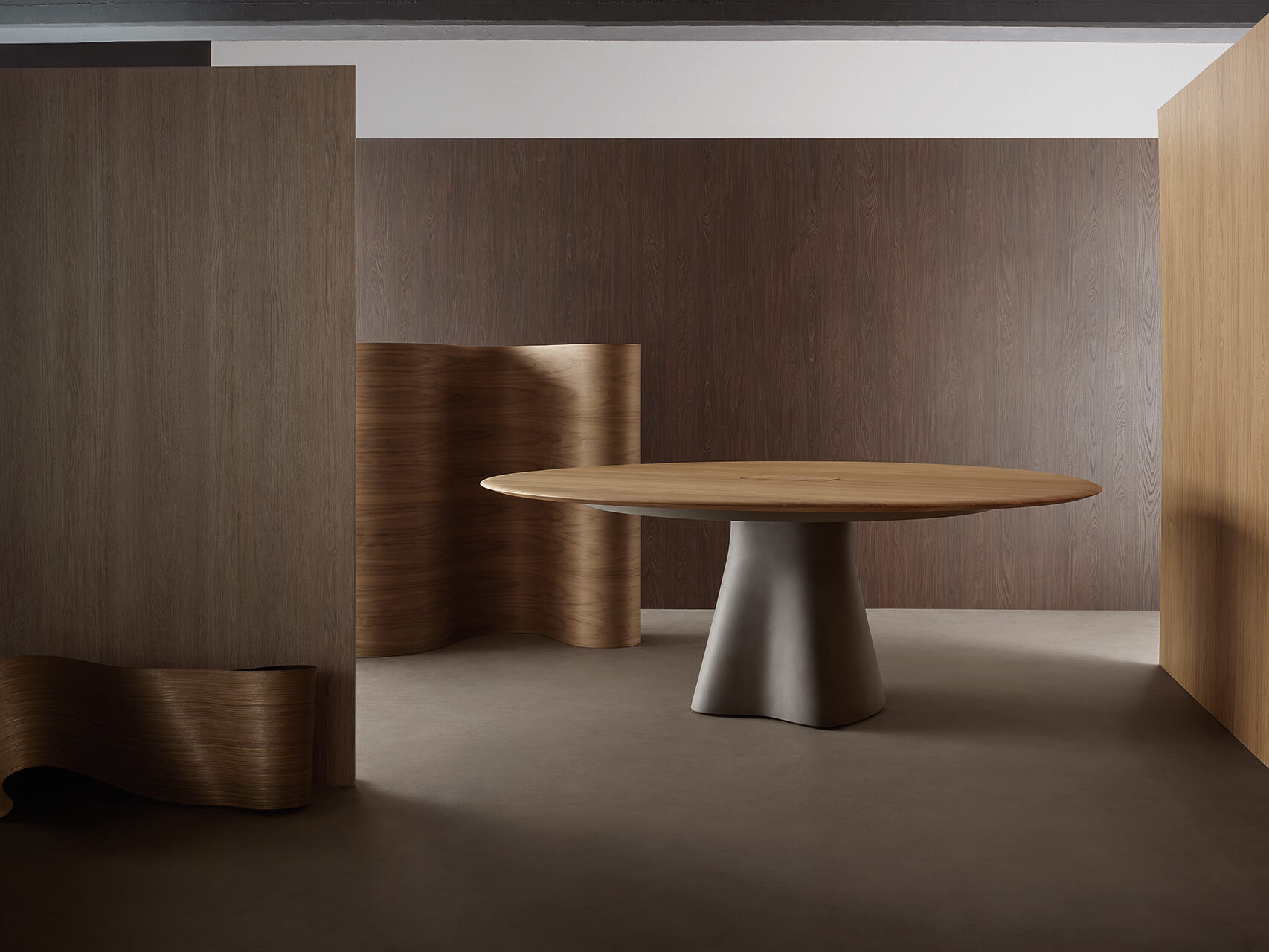 Temno to stół, który balansuje między architekturą a rzeźbą – stworzony z myślą o wnętrzach, gdzie mebel staje się głównym bohaterem przestrzeni. Monumentalna, pionowa podstawa wykonana z manufakturowego betonu przyciąga wzrok swoją gładką, matową powierzchnią o zaskakująco ciepłym i miękkim dotyku. Blat z litego drewna dopełnia całość, nadając konstrukcji naturalnej głębi i zmysłowości. Mimo swojej masywności, Temno sprawia wrażenie lekkiego – jego siła tkwi w subtelnych liniach i harmonijnych proporcjach. Temno dostępny jest zarówno w wersji prostokątnej, jak i okrągłej, co pozwala dopasować go do różnych typów przestrzeni – od domowej jadalni po eleganckie biuro. Na życzenie stół może zostać wyposażony w funkcję dyskretnej elektryfikacji, co czyni go nie tylko rzeźbiarskim elementem wnętrza, ale też w pełni funkcjonalnym rozwiązaniem do pracy i spotkań. To świadomy wybór dla tych, którzy poszukują formy o artystycznej sile wyrazu, ponadczasowej jakości i nowoczesnej funkcjonalności.